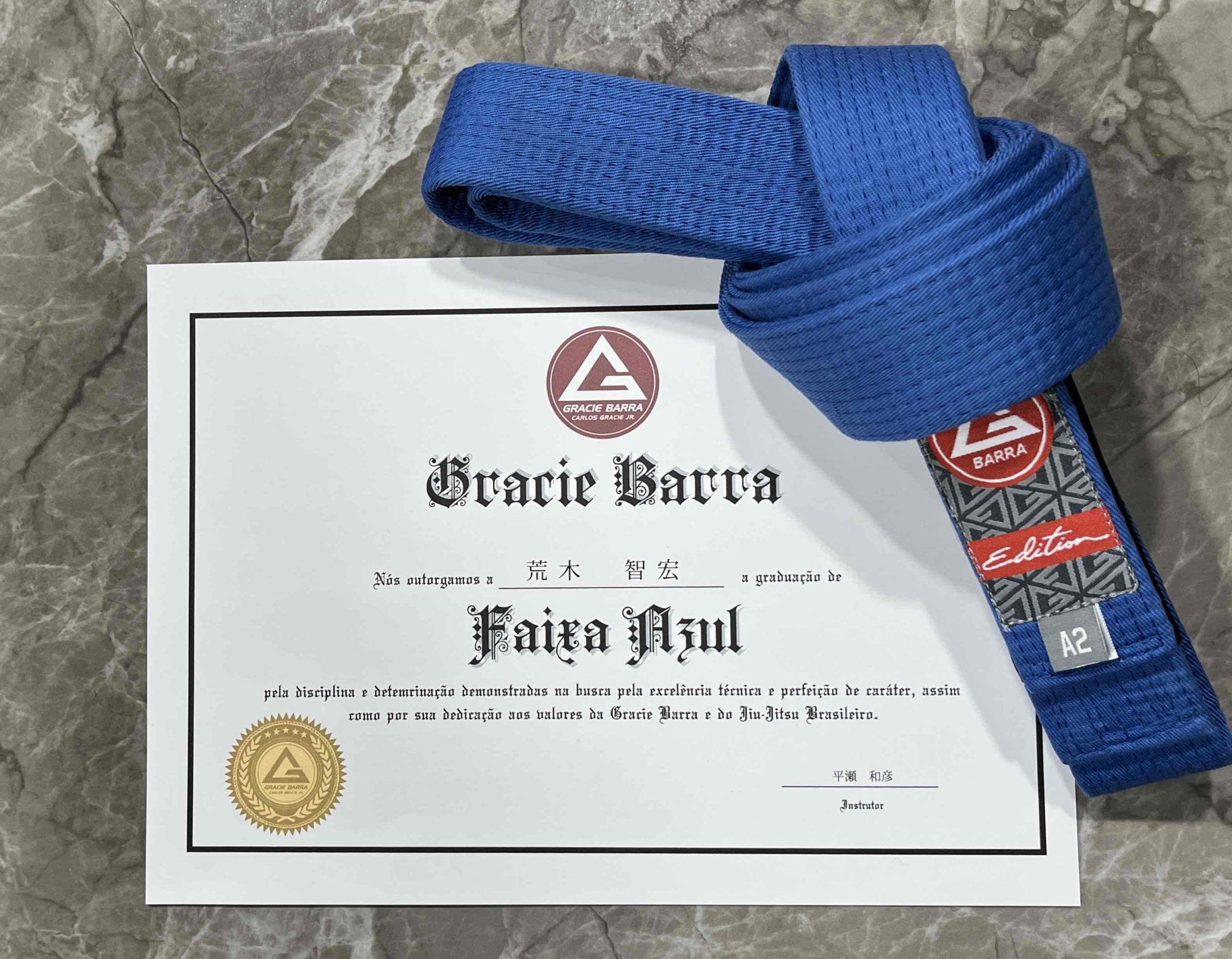 この度、グレイシーバッハ鳥取の平瀬和彦先生より改めて青帯を頂きました。